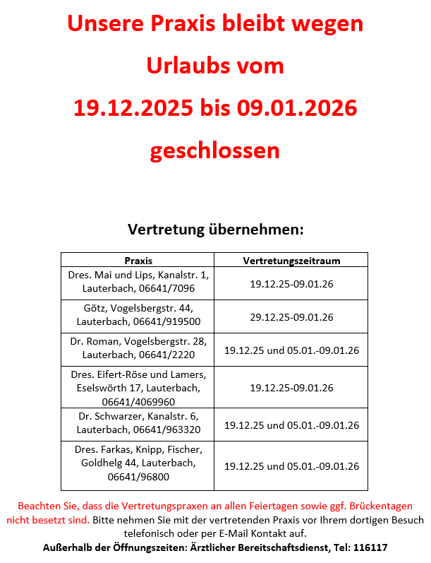 Praxis-Urlaub19.12.25 - 09.01.26 23.02. - 27.02.26 02.04. - 10.04.26 29.06. - 17.07.26 05.10. - 09.10.26 24.12.26 - 01.01.27